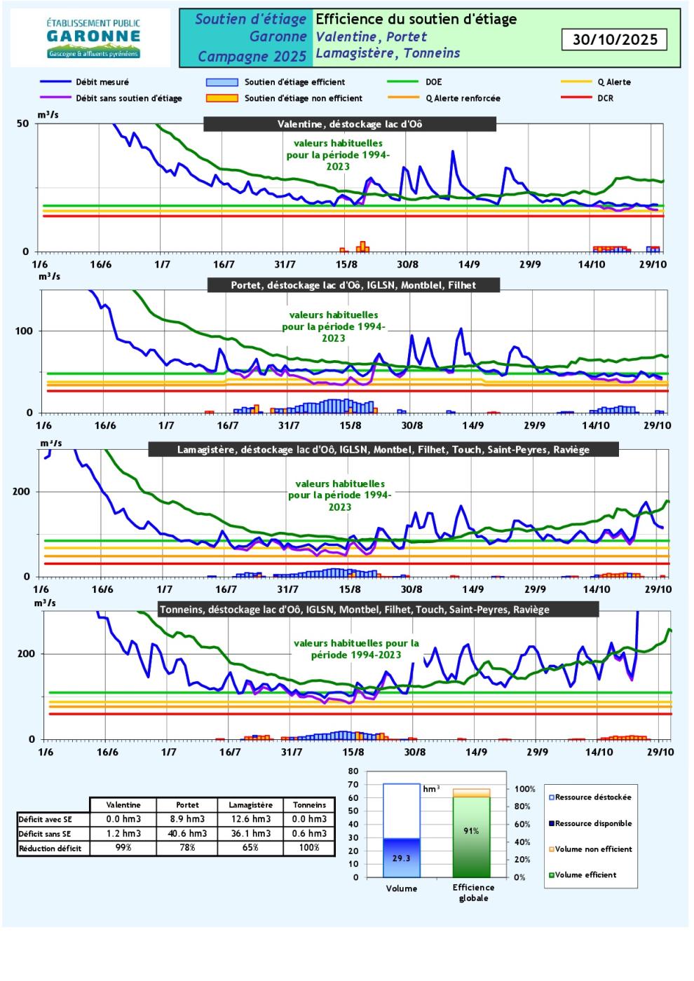 Ces schémas illustrent les débits, avec, et sans soutien d'étiage du 1er juin au 31 octobre, comparés aux valeurs habituelles pour la saison (courbe verte). L'illustration renseigne également sur l'efficience hydraulique du soutien d'étiage (en %) et sur les déficits, avec, et sans soutien d'étiage (en millions de m3).