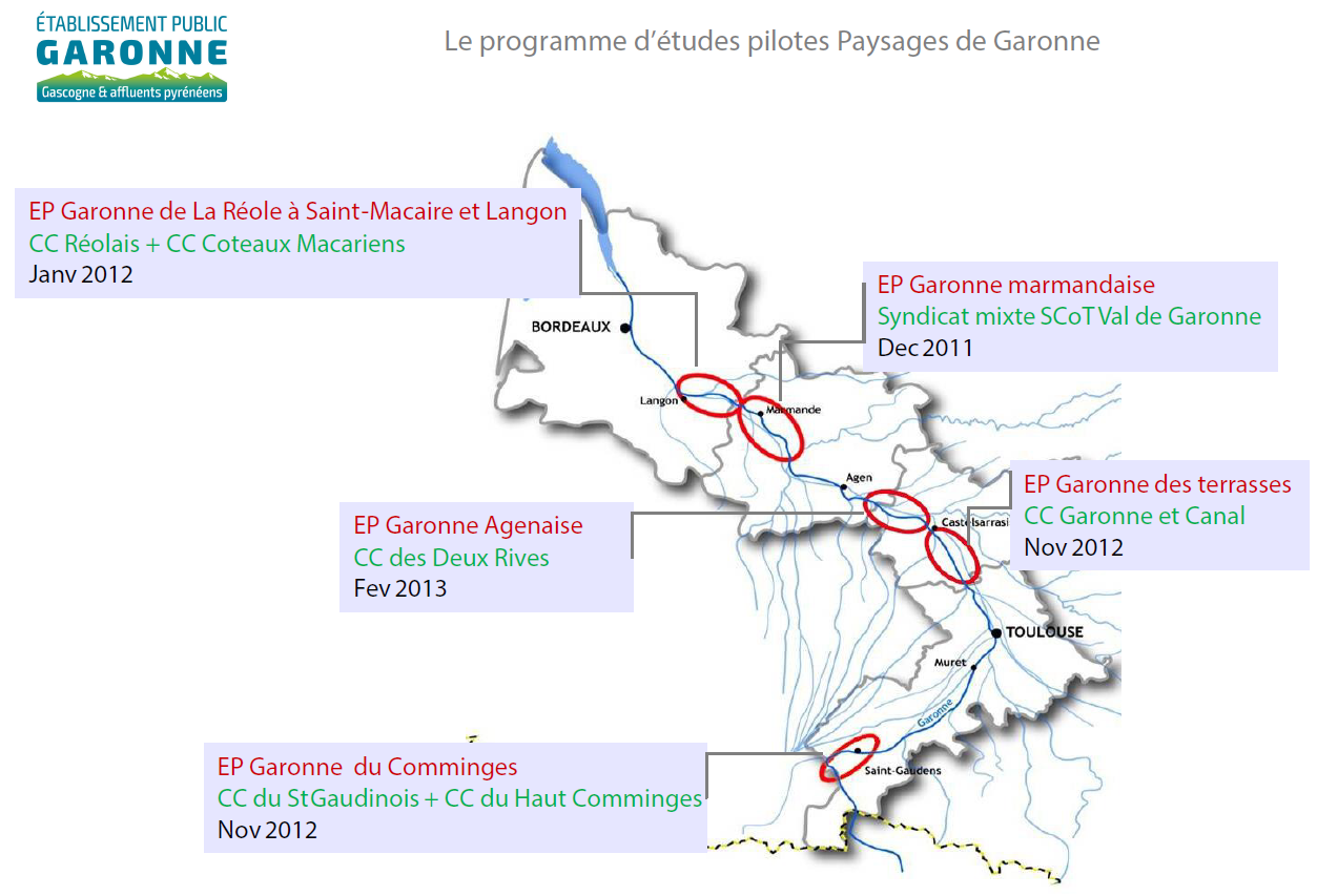 L'Etablissement Public Garonne, Gascogne et affluents pyrénéens a conduit, avec la Dréal Midi-Pyrénées et des collectivités riveraines, cinq études pilotes territoriales sur différents paysages de Garonne. Prolongement opérationnel de la première étude paysagère sur la vallée, ce programme a pour objectif de rapprocher les populations de leur fleuve, d’aider les collectivités à mieux le prendre en compte et le valoriser dans le développement local, et d’initier la réalisation de projets tout en assurant la préservation de ce bien commun. Ce programme a occasionné différentes collaborations :