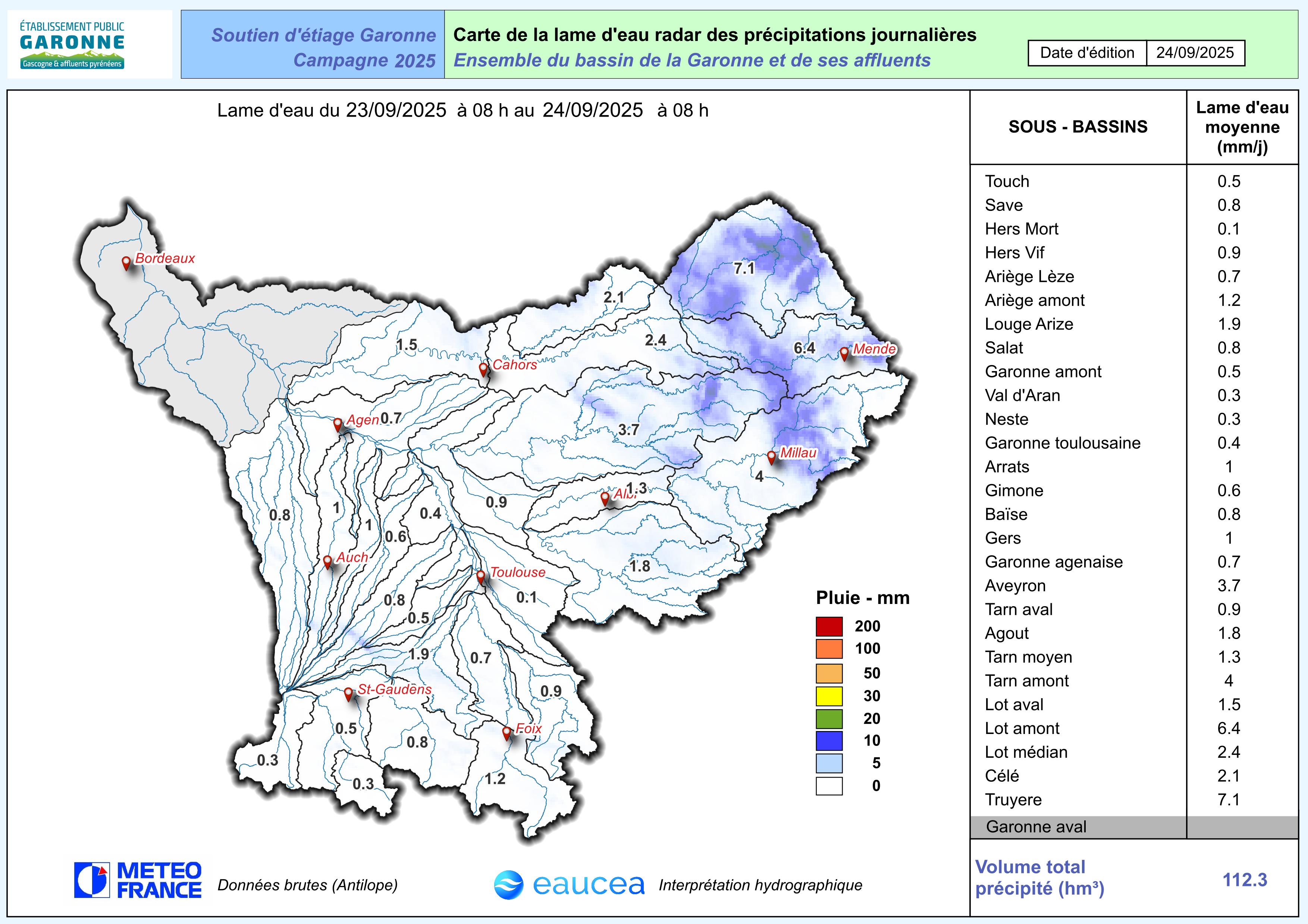 Cette carte illustre les quantités d'eau précipitées sur 24 heures par sous-bassins versants (source : images radar Météo France).