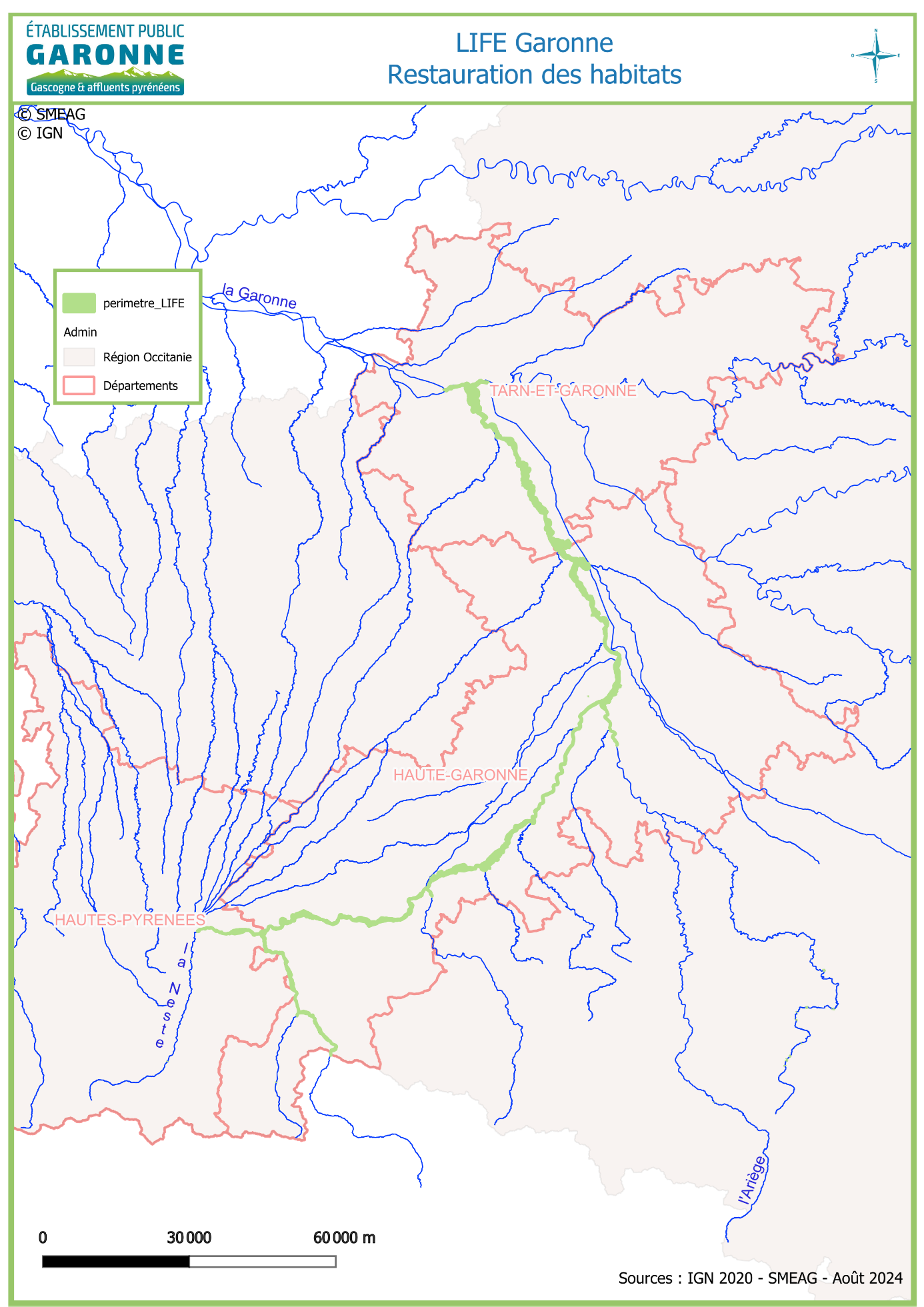 Le périmètre défini s’étend sur près de 300 kilomètres de la frontière Espagnole jusqu’au plan d’eau de St Nicolas de la grave dans le Tarn-et-Garonne. La partie aval de la Neste présentant des enjeux importants pour le transit sédimentaire, est également incluse dans ce périmètre.