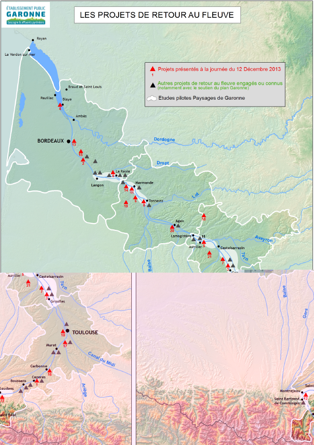 L'Etablissement Public Garonne, Gascogne et affluents pyrénéens a conduit, avec la Dréal Midi-Pyrénées et des collectivités riveraines, cinq études pilotes territoriales sur différents paysages de Garonne. Prolongement opérationnel de la première étude paysagère sur la vallée, ce programme a pour objectif de rapprocher les populations de leur fleuve, d’aider les collectivités à mieux le prendre en compte et le valoriser dans le développement local, et d’initier la réalisation de projets tout en assurant la préservation de ce bien commun. Ce programme a occasionné différentes collaborations :
